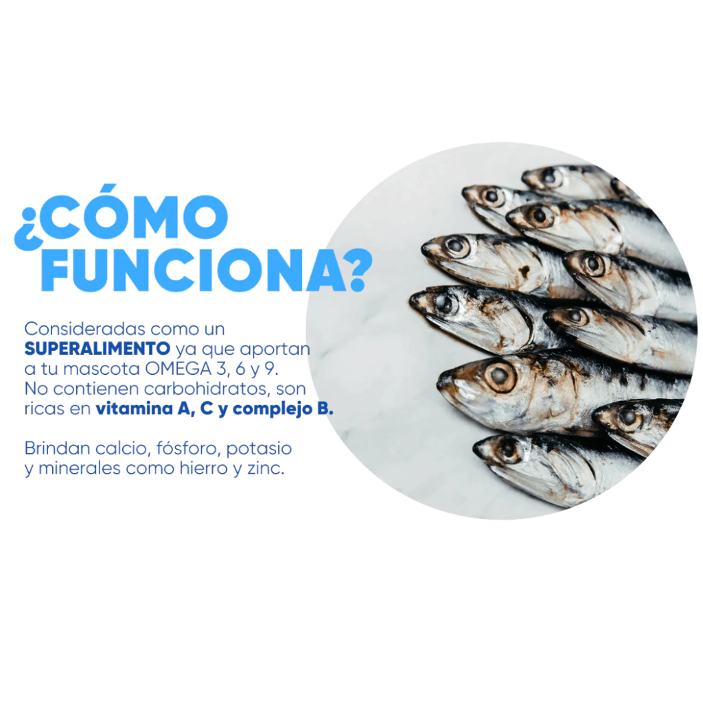 Nuestras anchovetas deshidratadas del Pacífico Mexicano son una fuente natural de Omega 3 y 6, esenciales para un pelaje brillante, una piel saludable y un corazón fuerte. Además, aportan vitaminas y minerales que contribuyen a un sistema inmunológico robusto. ¡Un premio delicioso y nutritivo que tu mascota amará!